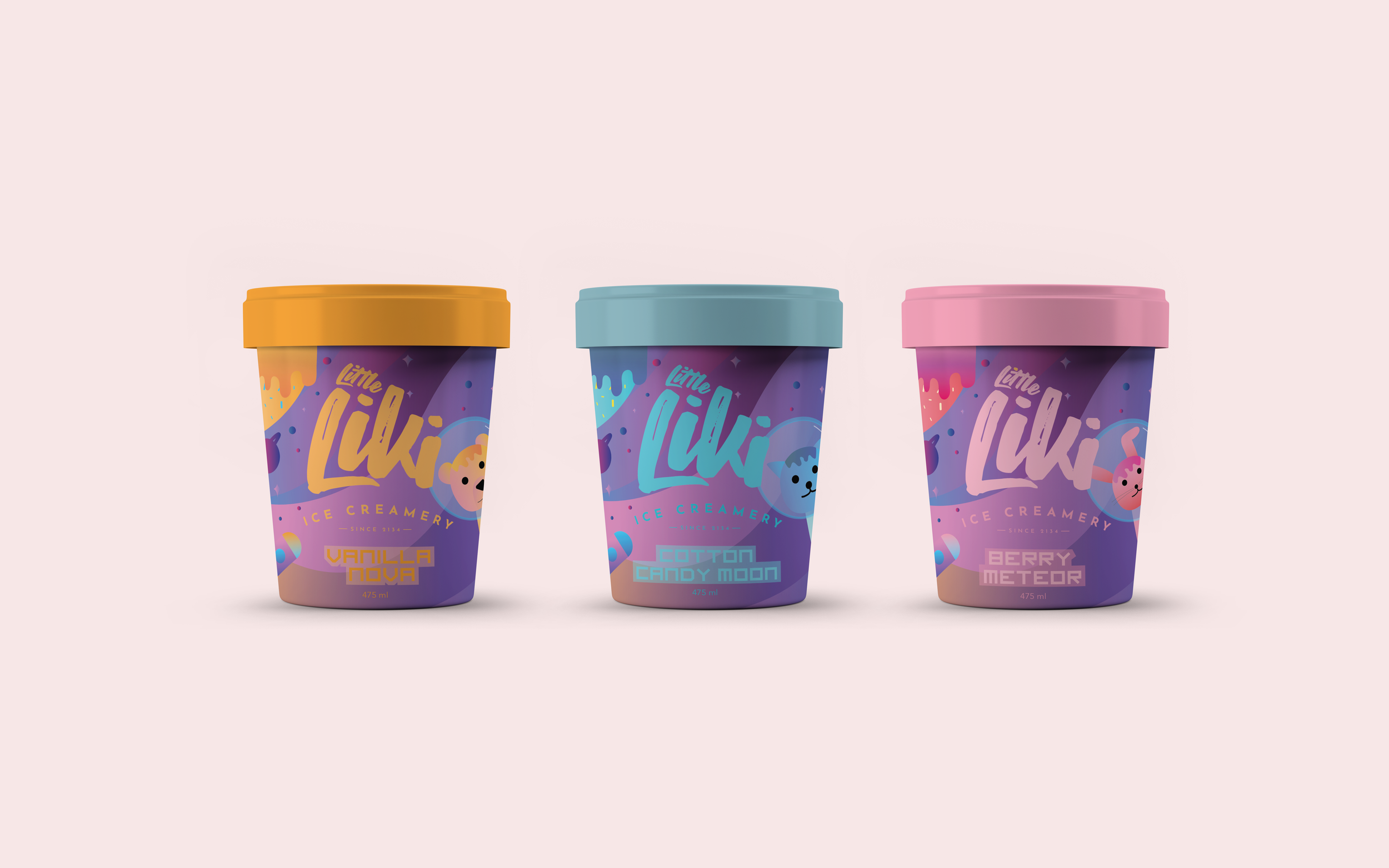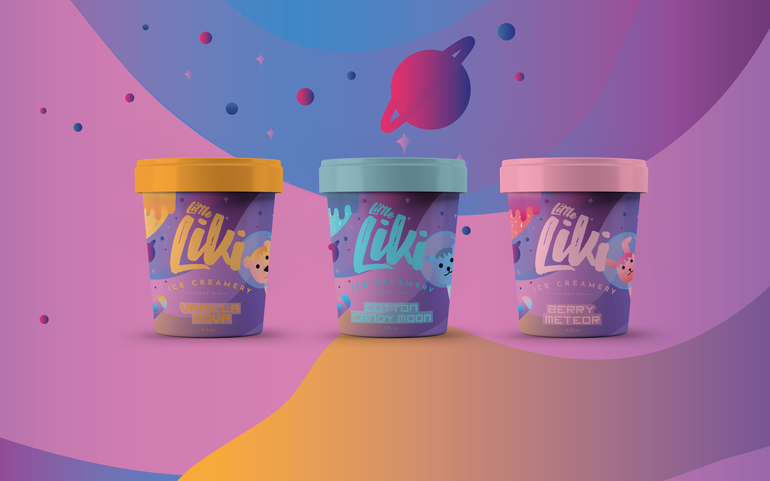 A boutique ice cream brand wanted fresh packaging for their new ice cream flavors designed for kids from 3 to 8 years old. This space-themed ice cream was designed around the story with which animals go on an adventure to the outer space to discover unique and extraordinary flavors on other planets.